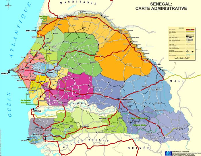 Quatorze régions dont les chefs-lieux sont les principales villes : Dakar, Diourbel, Fatick, Kaffrine, Kédougou, Kaolack, Kolda, Louga, Matam, Saint Louis, Sédhiou, Tambacounda, Thiès, Ziguinchor.
